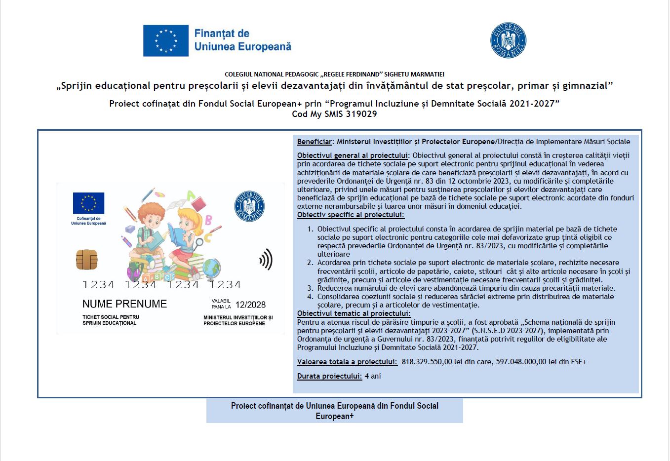 - Sprijin acordat: tichet social pe suport electronic, în valoare de 500 lei/an școlar, pentru achiziția de materiale școlare.